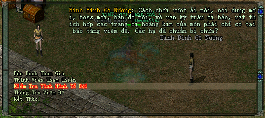 Vị Trí : 4 Cổng Thành Biện Kinh Chức Năng : Tham Gia Viêm Đế Bí Bảo Kiểm Tra Tổ Đội Tham Gia Mua Anh Hùng Thiếp Hoặc Viêm Đế Lệnh |
